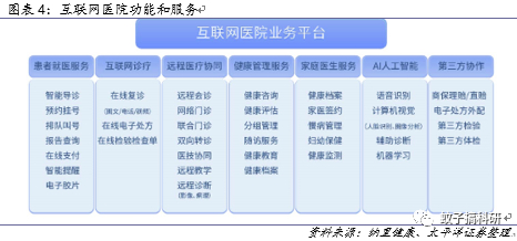 互联网医院的功能多样化,一方面可以定位补充线下实体医疗机构服务缺失,提供预约、诊前咨询、远程会诊、在线开方、审方、药品配送、在线随访和转院等服务,另一方面作为区域内资源的接口,还可以实现双向转诊、分级诊疗、远程诊疗和处方外流的功能。
