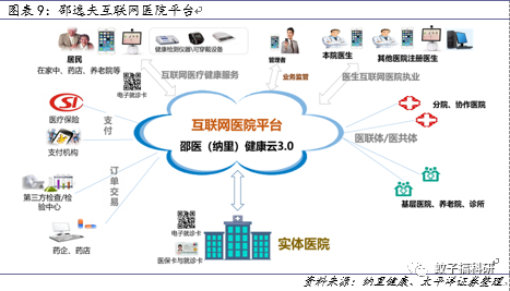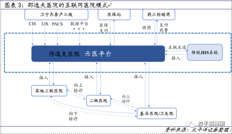 (1) 大型三甲医院主导的互联网医院:以三甲医院为中心,联动周边资源。大型三甲自身的口碑和医疗资源实力很强,每天的接诊量是非常饱满的,线上互联网医院的作用更多是提高院内就诊的效率,医生可以利用碎片化的时间完成更多日常诊疗和慢病复诊,医院自身实力可以吸引和集结到第三方合作厂商包括药厂、药品配送、医疗器械厂商,形成自己的医疗闭环,邵逸夫医院是这种模式的典型案例。