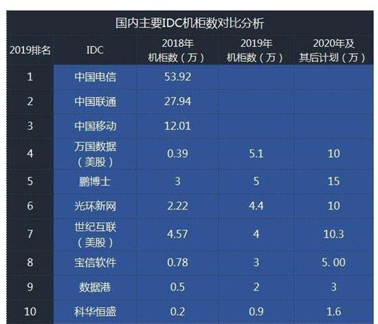 比如光环新网,2018年底运营机柜数约2.2万台,通过并购科信盛彩100%的股权增加8100个,其他新增大概6000个,2019年大概机柜数月4.4万个,通过持续的并购和整合,未来计划形成10万台机柜的保有量。