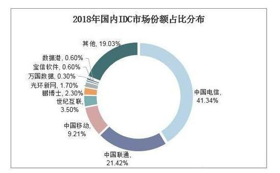 目前国内IDC市场由基础电信营业商所主导,2018年国内三大电信运营商合计占据71.97%的市场份额,中国电信、中国联通、中国移动分别占据41.34%、21.42%和9.21%的市场份额。