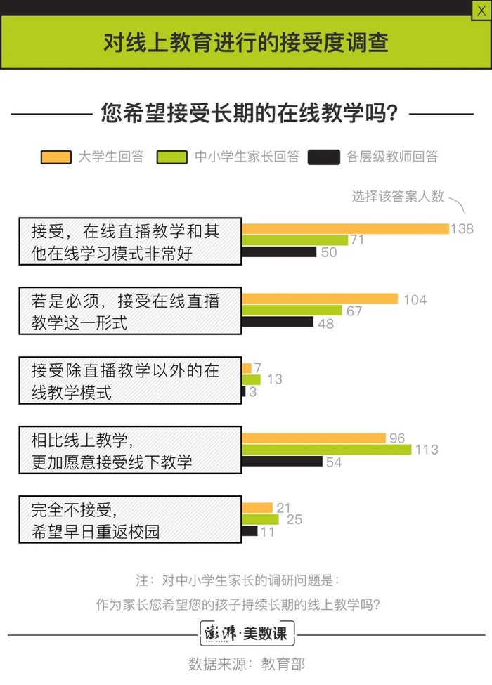 中小学生和各层级老师的接受程度稍低一些,他们更希望能够早日恢复线下教学。也有很大一部分被调查者认为,在线教育是一个“非常好的学习模式”。