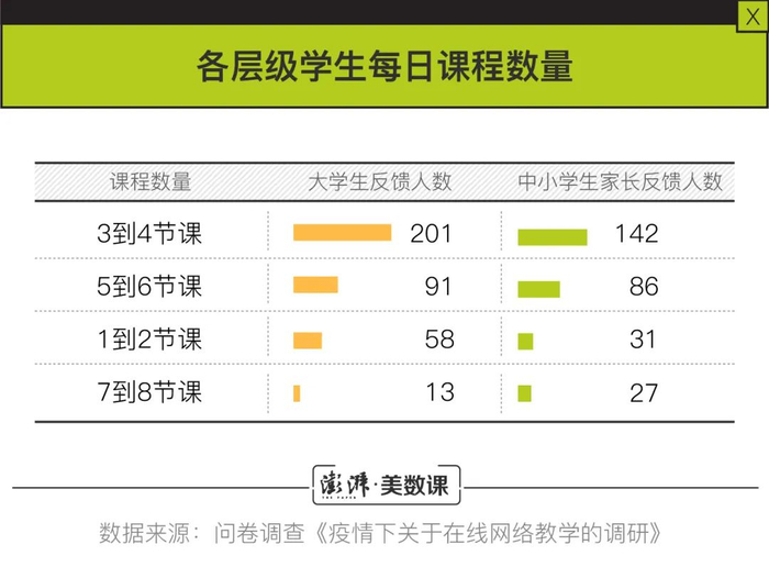 目前大、中、小学生的上课时间、频率都有明显减少。问卷统计显示,多数中小学生每日接受课程的时长集中在2-3小时之间,大学生每日接受课程的时长集中在2-4小时之间。大部分学生每日仅在网上上3-4节课。