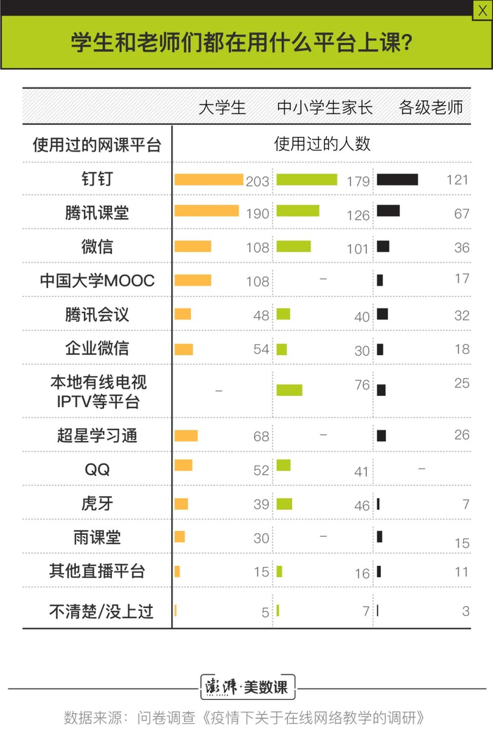 大部分“停课不停学”方案中,都未提及使用钉钉、微信、QQ等社交通讯与办公软件来授课。问卷统计显示,不管是教育部门,还是各个大学的指定教学平台,流行程度不及市场化互联网公司软件。