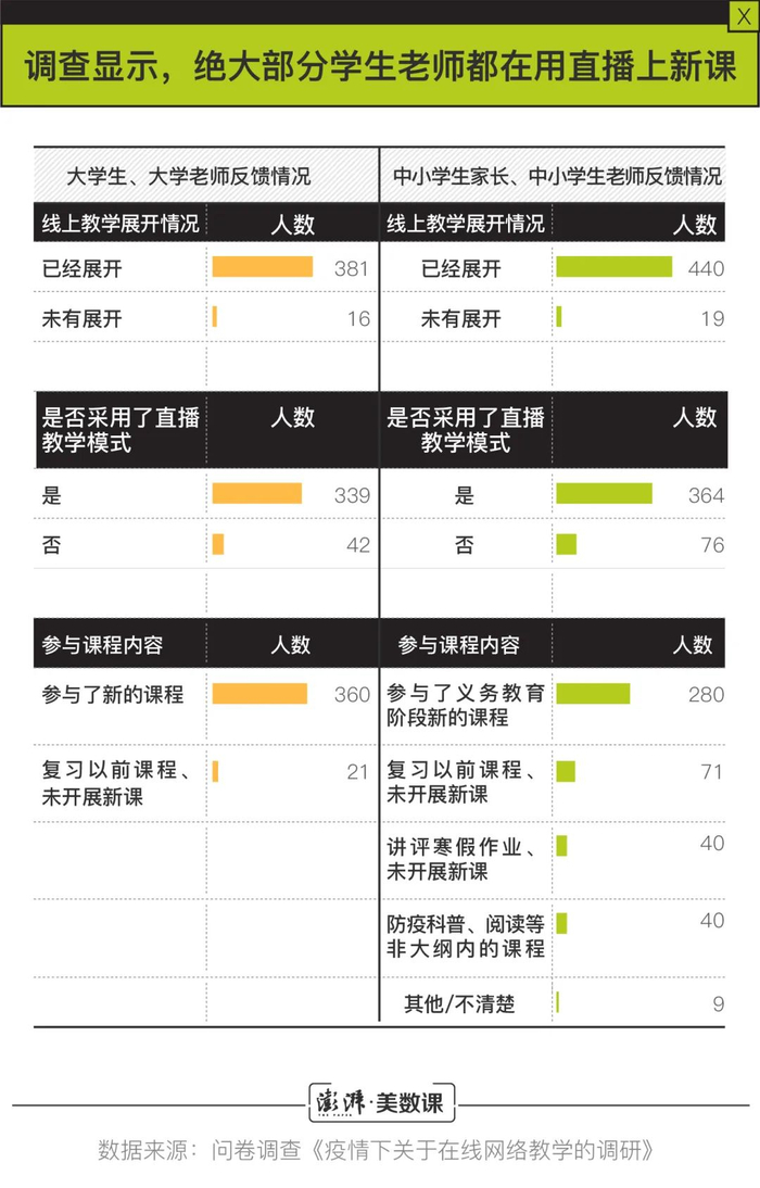 澎湃新闻在问卷调查中发现,2月26日,超过90%的大学生、老师、中小学生家长受访者都表示线上教学活动已开始进行。绝大部分学生接受课程的方式都包括参与在线直播课程,三分之二左右的中小学生家长表示孩子已开始上义务教育阶段新课。