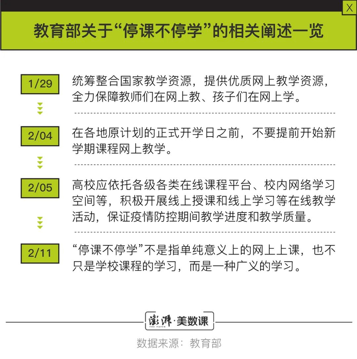 “大规模在线直播课堂,是40年来人类教育历史上最大规模的实验。”北京大学教授刘德寰在自己的个人公众号上,对目前线上教育有如此评价。然而仔细梳理教育部近期的发布政策来看,“停课不停学”既不意味着强求所有教师出镜,单纯地在线直播授课;也不意味着提前上新课。