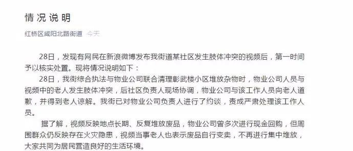 其中写道,在清理彰武楼小区堆放杂物时,物业公司人员与视频中老人发生肢体冲突。事后,物业及该工作人员向老人道歉,并得到谅解。街道还约谈了物业公司负责人,责成物业严肃处理该工作人员。