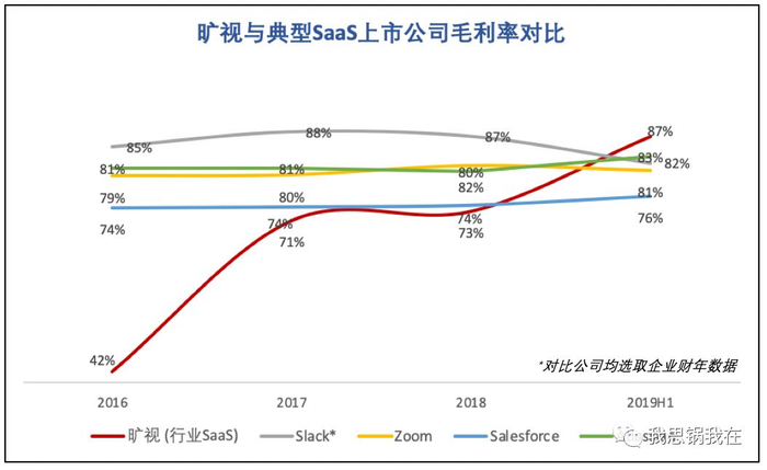 首先,我把美国四家典型SaaS上市公司的毛利率与旷视的“行业SaaS”进行比较: