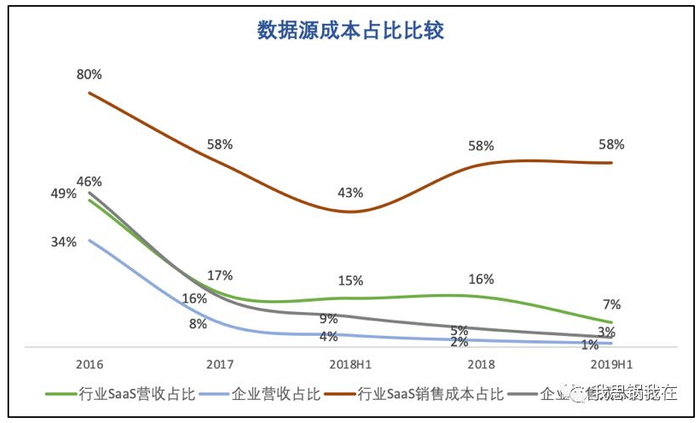 相对云服务成本,数据源成本占行业SaaS销售成本大头,接近60%。由于2018年全年平均比例大于2018年上半年,我们有理由认为2019年全年平均比例也会比2019年上半年的数字有所提升,近两年呈上升趋势;