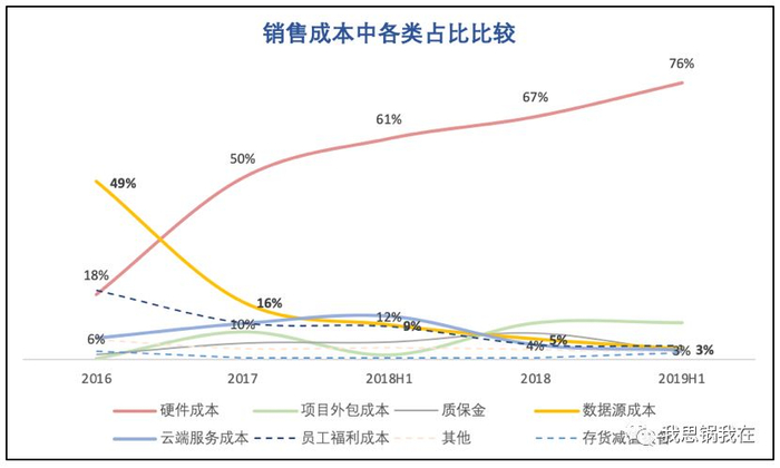 最后从公司整体销售成本结构来看,除了硬件,外包、云服务和数据源是剩下的三大成本。而AI三要素:算法、算力和数据,后两者都与之息息相关。