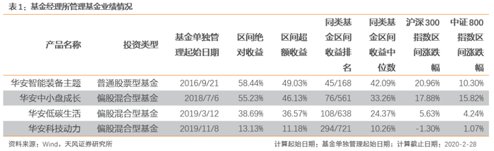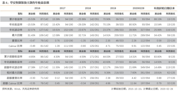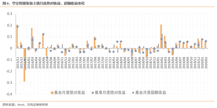 李欣先生所管理的华安智能装备主题在绝对收益、超额收益、收益风险比等指标的衡量中表现优异,自有效起始日期2015-10-15至2020-02-28,基金业绩突出,基金年化绝对收益15.54%,同类基金排名13/135(前9.6%);基金月度胜率较高,为55.8%,基金在市场上涨较快以及市场风格偏向小盘的情况下表现较好。