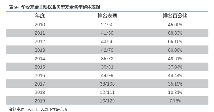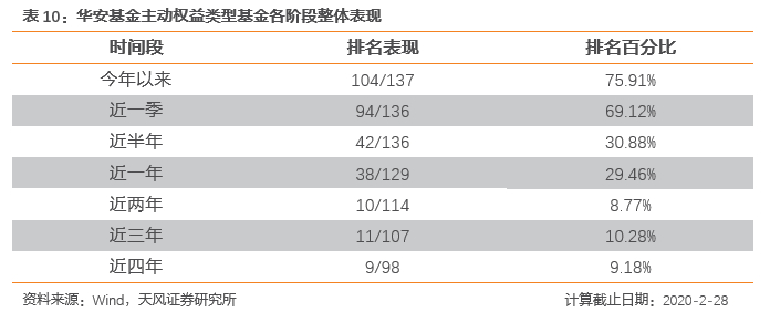 对同类基金个基复权单位净值增长率去极值标准化,并按基金当期规模加权得到各基金公司主动权益类基金整体表现,据此计算华安基金各阶段收益排名。根据下表可以看到自2010年以来,除2011、2012、2013年,华安基金主动权益类基金各年表现均保持在市场前50%以内。值得注意的是,华安基金近两年整体排名表现亮眼,2018年在111家基金公司中排名第12,2019年在129家基金公司的排名进一步提升至第10。