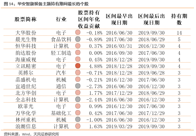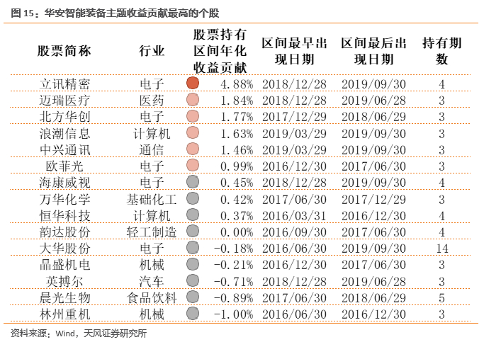 下图对基金在年报、半年报和季报所公布过的所有持股信息进行了汇总,假设基金对每只个股在财报公布日开始持有,保持至个股连续出现最晚时点的下一季度末,计算区间内个股持仓的年化收益贡献。以下罗列了在持仓假设下基金持有时间最长的15只个股,以及在财报中出现两次以上且年化收益贡献最大的个股。可以看到华安智能装备主题中持有时间最长的15只个股中有7只个股收益贡献为正,基金具有优秀的长期选股能力。