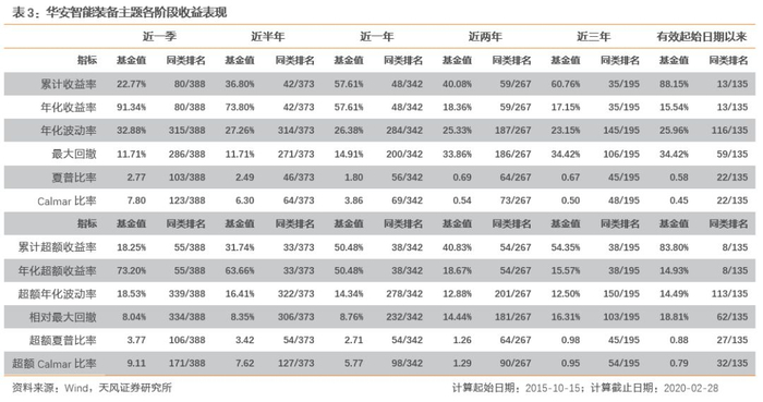 考虑基金接管之后的建仓期间,对新接管基金的基金业绩有效起始日期修正为基金接管日期的3个月之后。通过统计各个阶段基金的收益情况,可以看到基金业绩管理能力突出。华安智能装备主题有效起始日期2015-10-15至今2020-02-28,基金年化绝对收益15.54%,同类基金排名13/135(前9.6%),年化超额收益14.93%,同类基金排名8/135(前5.9%);同时,基金最大回撤为34.42%,位于同类基金的后43.7%,相对最大回撤为18.81%,排名位于同类基金后45.9%,基金对回撤的控制能力较为出色。有效起始日期以来,华安智能装备主题以同类排名后43.7%的最大回撤,获取了同类基金排名前9.6%的绝对收益。