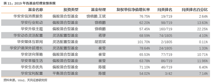 2019年,几位基金经理的代表产品同类表现均十分优异,各基金经理表现最好的基金排名均在同类前6.4%以内。