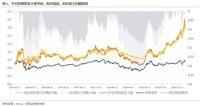 下图绘制了有效起始日期以来基金的净值曲线、相对强弱曲线、动态最大回撤曲线以及动态相对最大回撤曲线。可以看到,华安智能装备主题相对基准在2016年上半年、2017年下半年以及2019年表现出色,基金净值大幅跑赢基准曲线。基金的最大回撤保持在40%以内,相对基准的回撤控制在20%以内。