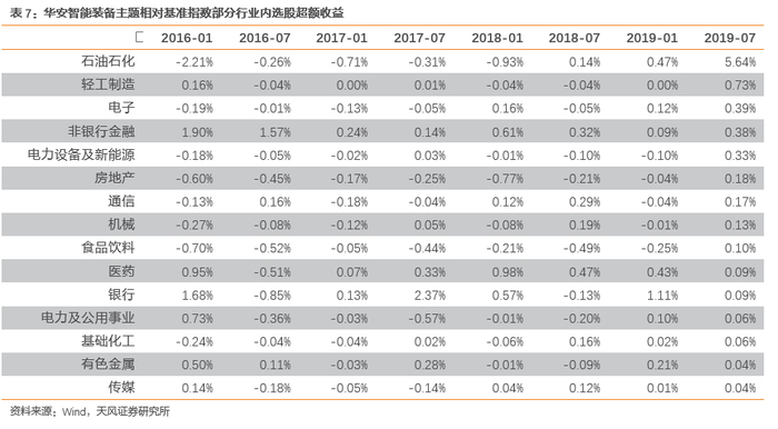 下图列出了基金相对基准选股效应超额收益贡献较高的部分行业。可以看到2019年中,基金相对基准指数在石油石化、轻工制造以及电子等行业的行业内选股效应超额收益贡献排序靠前。结合图17华安智能装备主题行业配置偏好中,基金在2019年中报的披露中石油石化行业以及轻工制造均占总资产的0.05%以下,基金在这两个行业的行业内选股超额收益贡献分解结果更多来自于个别股票的收益,代表性较低。而2019年中报基金在电子行业的配置比例占到总资产的18.97%,行业内的选股效应分解结果相对更具有代表性,此外我们注意到,配置较高的通信、机械等行业在选股效应的排序中均处于相对靠前的位置,代表2019年中期基金在电子、通信、机械等行业相对具有较高的行业内选股能力。