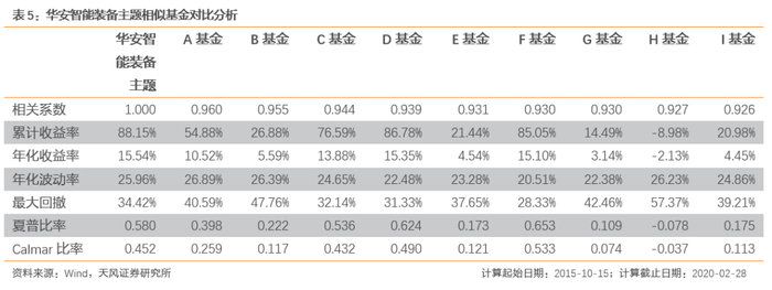我们从收益率相关性角度从全市场普通股票型基金中分别筛选了与华安智能装备主题同时期相关性分别最高的9只基金,结果如表5所示。可以发现,华安智能装备主题在相似度最高的几只基金中的收益率最高,9只基金中仅有2只基金的夏普比率以及Calmar比率高于华安智能装备主题基金。