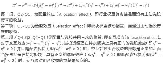 根据Brinson,Hood & Beebower (BHB,1986)的观点,基金相对于基准的超额收益即为主动管理的收益,超额收益的来源有三部分: