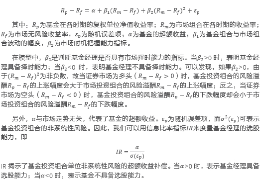 基金经理的选股能力和择时能力的度量,可以通过对其管理基金的资产动态配置能力分析入手。T-M模型(Treynorand Mauzy,1966)在CAPM模型的基础上引入市场超额收益的二次项来衡量基金经理的市场把握能力,同时通过截距项得到基金经理的选股能力: