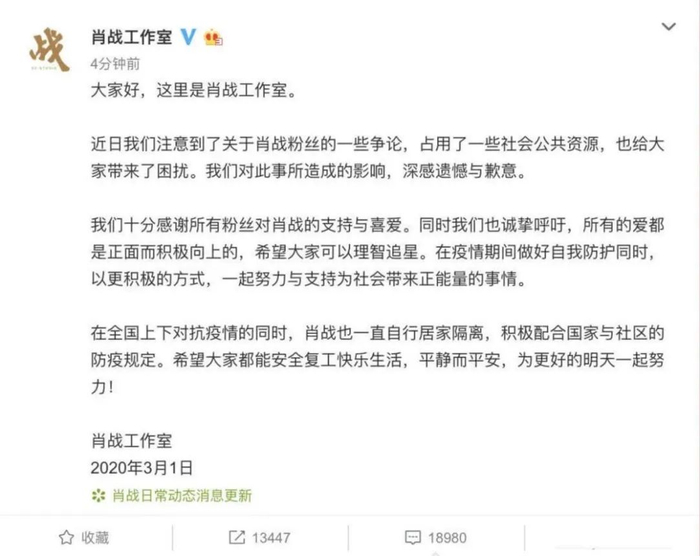 3月1日晚,肖战工作室突然发文道歉,内容如下: