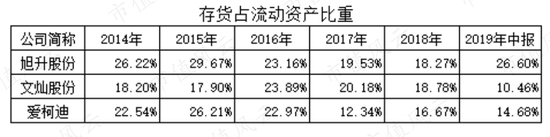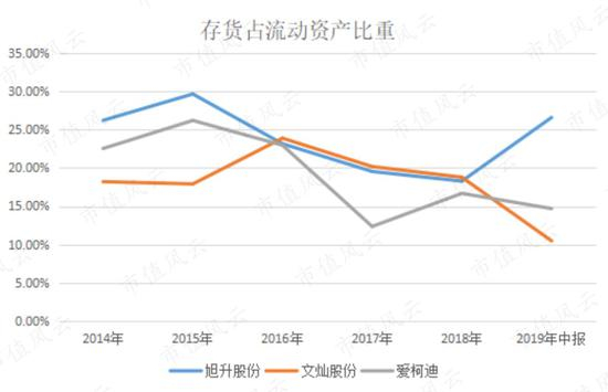 整体看,存货占流动资产的比重呈现下降趋势,但是,旭升股份在2019年中报出现大幅增长。