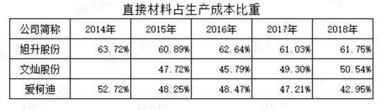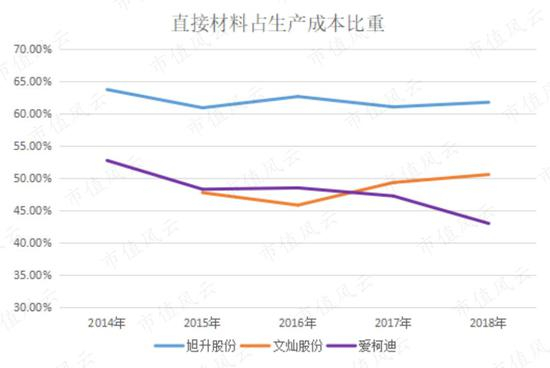 从上图表可以看出,直接材料占生产成本的比重,旭升股份最高,并且稳定在60%-65%之间;文灿股份稳定在45%-50%之间;只有爱柯迪呈现下降趋势,2018年在43%左右,最低。