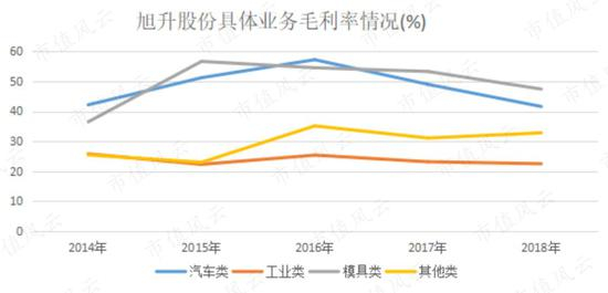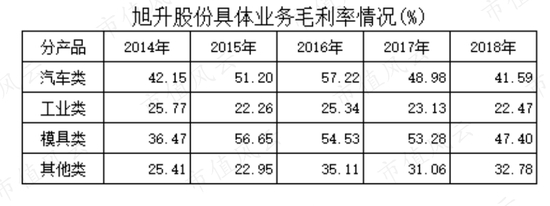 从上方图表不难看出,旭升股份汽车类压铸件和模具压铸件的毛利率较高,但,这两项业务的毛利率从2017年出现下滑,其中: