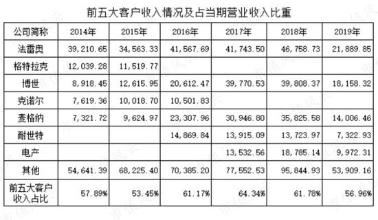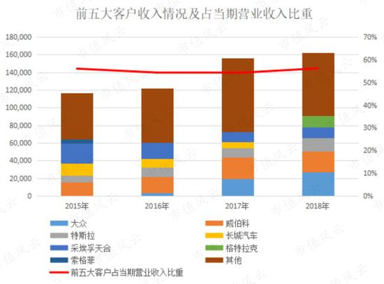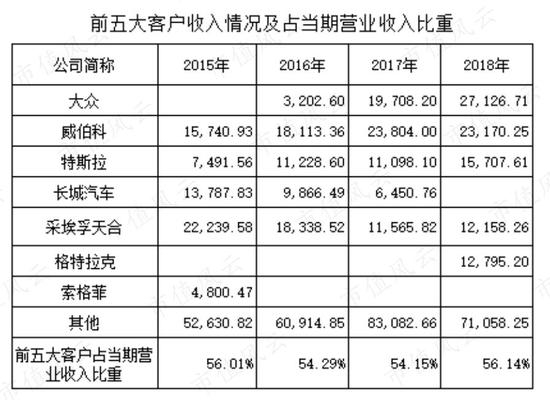 2015-2017年,前五大名客户包括采埃孚天合、威伯科以及特斯拉等,销售额收入合计占当期营业收入的55%左右;同期,对特斯拉的销售收入分别是7492万元、1.12亿元、1.11亿元,收入占比均不到当期营业收入的10%。