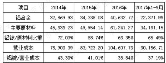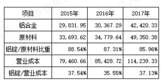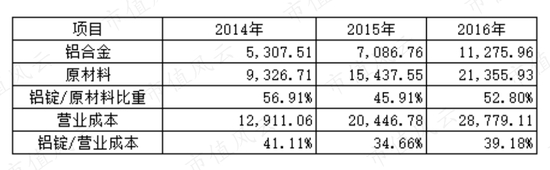 从上市公司披露的2014-2016年采购数据看,购买铝锭成本占到原材料采购金额的45%-56%,同期,约占营业成本的35%-40%。
