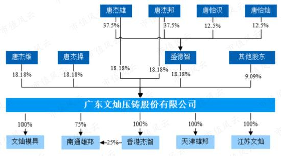 前身广东文灿压铸有限公司,成立于1998年9月4日,并于2014年10月变更为股份公司。唐杰雄、唐杰邦合计直接和间接控制公司54.55%的股份,为公司实际控制人。