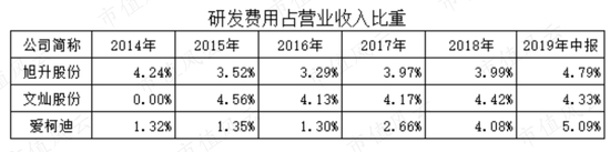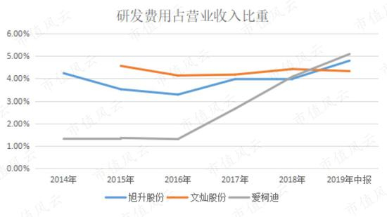 从研发费用占营业收入比重看,最近两年,3家公司的研发投入占比非常接近,并且都呈现增长趋势,其中文灿股份比较高,长期保持在4.3%上下;旭升股份保持在4%左右,2019年中报达4.8%;爱柯迪增长非常明显,从2014年的1.32%增长到2019年中报的5.09%。