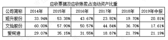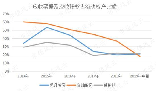 应收票据及应收账款占流动资产比重,2017年以来旭升股份与爱柯迪两家公司均非常接近20%;而文灿股份则是一路快速下降,从2014年的60%下降到2019年中报的17.61%。