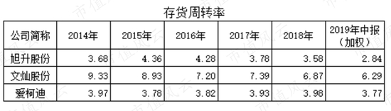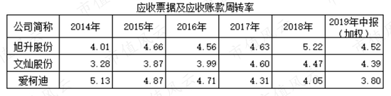 爱柯迪的存货周转率在3.8-3.9,比较稳定;旭升股份出现小幅下降,从2015年的4.36下降到2019年中报(加权)的2.84;文灿股份的存货周转率要高于前二者。