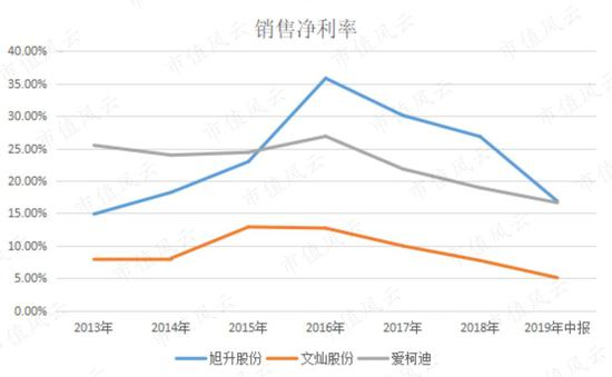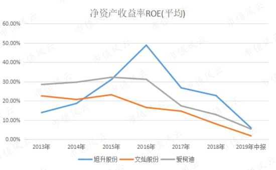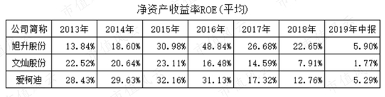 旭升股份从2016年的35.78%下降到2019年中报的16.85%,下降了19个百分点;同期文灿股份从12.72%下降到5.09%,下降了近8个百分点;同期爱柯迪从26.85%下降到16.63%,下降了20个百分点。下降幅度均比较大。