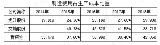 旭升股份的制造费用占生产成本比重最低,但呈现小幅上升趋势;文灿股份长期保持在40%左右;爱柯迪上升趋势明显,2018年接近43%,超过文灿股份。