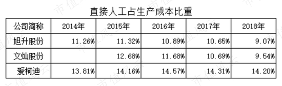 直接人工占生产成本的比重,旭升股份与文灿股份非常接近,而爱柯迪高于前两者,并且长期保持在14%以上。
