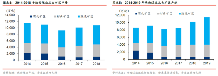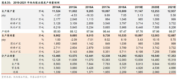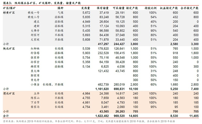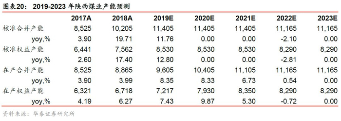 公司权益核定产能8530万吨。2015-2016年,公司根据市场需求、吨煤利润情况,将渭北矿区负担较重的1850万吨落后矿井产能剥离,压减低热值煤和贫瘦煤产量,同时加大陕北矿区、彬黄矿区的产能核定工作力度,扩张陕北矿区、彬黄矿区的产量,如小保当2019年初核定产能从1600万吨上行至2800万吨。