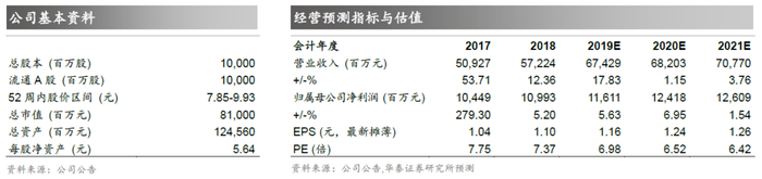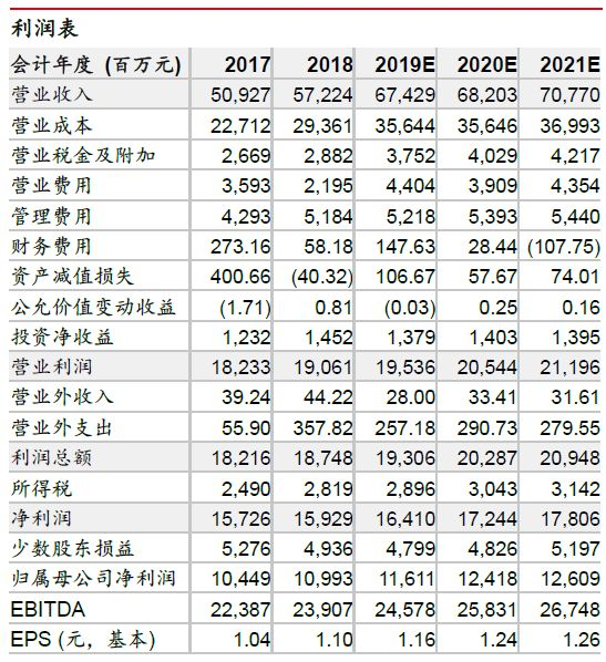 19-21年业绩小幅增长。我们预测公司2019-2021年业绩分别为116、124、126亿元,对应PE分别为6.98、6.52、6.42倍。2020年2月26日,公司业绩预告称2019年盈利116亿元。