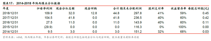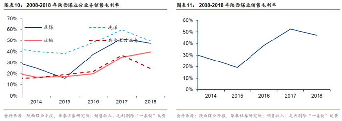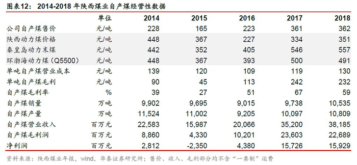2017-2018年盈利相对稳定。2015年是行业低迷期,2016年行业出现好转,公司在2015、2016年分别剥离位于渭北矿区的560、1310万吨产能,持续优化资产质量。2017年,彬黄、陕北矿区产量提升较多,公司自产煤销量上行,煤价继续上行,公司业绩达到157亿元;2017以来,长协等价格机制运行,煤炭市价、公司售价波动下降,盈利趋于稳定。