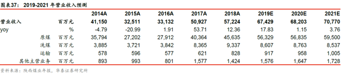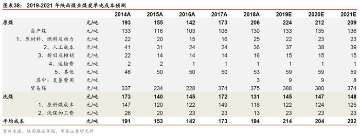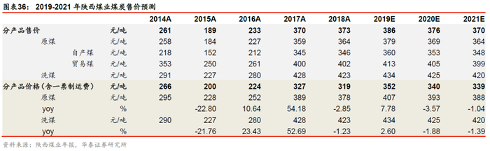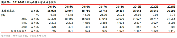 公司产销率接近100%。2016年以来公司产销率水平较高,分矿区看,渭北、彬黄矿区产销率接近100%,陕北矿区销量较产量低200-300万吨,故假设2019-2021年陕北矿区销量较产量低250万吨。具体到品种上,我们假设2019年洗煤、贸易煤销量取2倍上半年值,2020-2021年洗煤、贸易煤销量为近两年加权值,洗煤原料为自产煤,因此扣除洗煤销量后,剩余为自产原煤。