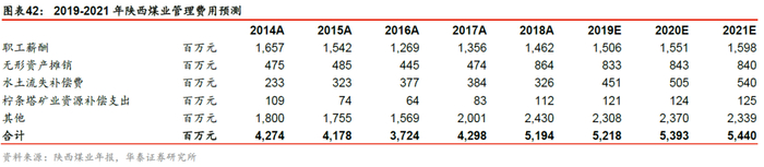 我们将管理费用拆分成职工薪酬、无形资产摊销、水土流失补偿费、柠条塔矿业资源补偿支出及其他,其中职工薪酬假设3%增速,其他取近两年加权值。无形资产摊销在 2018年增长较多,主要因小保当探矿权转采矿权,并进入摊销,2019年无形资产摊销取2倍上半年值,2020、2021年取近两年加权值。按《陕西省煤炭石油天然气资源开采水土流失补偿费征收使用管理办法》,计征标准为原煤陕北5元/吨、关中3月/吨、陕南1元/吨,公司的陕北矿区属于陕北,其余属于关中。柠条塔矿业资源补偿在2019-2021年期间每年向神木两家煤矿合计补偿160万吨,两家煤矿向公司补偿成本43元/吨。