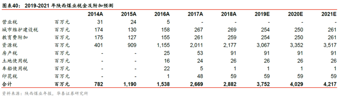 煤炭资源税上升较多。根据《关于调整陕西省榆林市煤炭资源税税率的通知》([2018]159 号),自2019年1月1日起,榆林市煤炭资源税税率由6%提高到9%。陕北矿区属榆林市,资源税率上调至9%,渭北矿区、彬黄矿区仍执行6%资源税率。城市维护建设税、教育附加为应缴纳增值税的5%,其余房产税、土地使用税、车船使用税及印花税取2018年值。