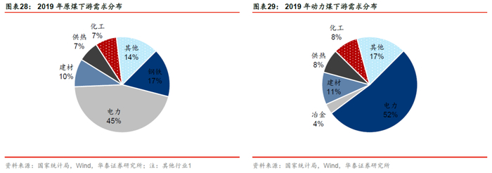 动力煤下游中,2019年电力需求占比达到52%,化工、建材等其次,炼焦煤下游主要为钢铁冶炼所需的焦炭。