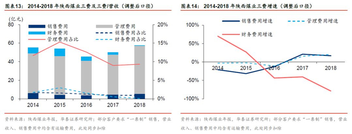 管理费用占比高、16年起财务费用下降多。2018年,公司管理费用增速较高,因小保当进入联合试运转,修理费、无形资产摊销增长。小保当进入联合试运转后,无形资产中的98.45亿探矿权价款转为采矿权价款,并开始摊销,无形资产摊销增长82%。