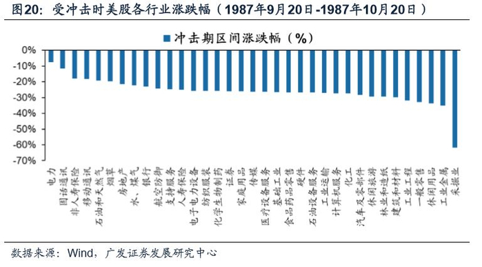 在受到“黑色星期一”影响后,美股全部行业均出现大幅下跌,顺周期板块跌幅更大,科技板块跌幅相对较小。由于市场担心连续多年贸易赤字和财政赤字会带来经济衰退,因此彼时周期类行业跌幅更大。跌幅前五行业为采掘业、工业金属、休闲用品、一般零售和工业工程,跌幅均在30%以上,其中采掘业跌幅更是达到惊人的61%。公用事业类和科技类相对抗跌,如电力跌幅小于10%,固话通讯、移动通讯跌幅在10%-20%之间。