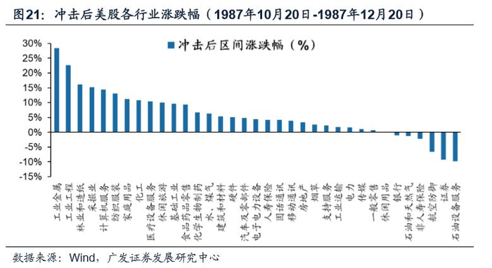 ●历史复盘:1987年黑色星期一美股如何演绎?美股估值较高、联储加息以及程式化交易导致美股在1987年10月19日星期一当日下跌超过20%。次日美联储提供流动性支持,货币转向宽松,当日美股就企稳,两个月震荡期后美股再度回归长期慢牛。由于市场担心连续多年双赤字会带来经济衰退,黑色星期一当天美股周期类跌幅更大,科技板块跌幅相对较小。黑色星期一冲击结束后2个月震荡期,绝大多数行业迎来上涨,市场对经济衰退担忧缓解,周期类表现相对较好。