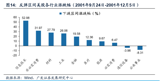 美股市场反弹期前期跌幅较大的科技类领涨,周期类次之,前期跌幅较小的公共事业和必须消费类相对靠后。在美股市场后续反弹的时间区间内(2001年9月24日-2001年12月5日),多数行业处于上涨状态,其中前期跌幅较大的信息技术行业领涨,涨幅达到了53%,位居第一。具有周期属性的非必须消费、材料、工业紧随其后,位居涨幅第二、三、四位,涨幅分别为32%、28%、26%。而前期抗跌的通信设备、公共事业反而下跌,分别下跌4%和8%。前期相对抗跌的必须消费也仅上涨6%,明显滞涨。