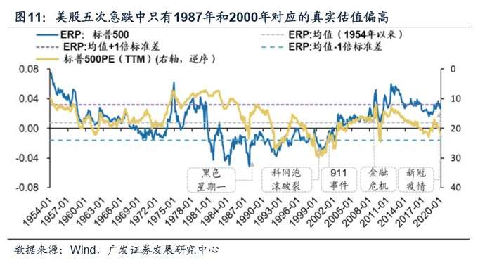 1950年-2019年的四次急跌中,只有1987年黑色星期一和2000年科网泡沫时期真实估值偏高,其他两次急跌前美股真实估值并不高。1987年黑色星期一和2000年科网泡沫时标普500的ERP均接近54年来的均值-1.5倍标准差,真实估值处于高位。而2001年911事件时标普500的ERP超过均值-0.5倍标准差,2008年金融危机标普500的ERP均接近均值+1倍标准差,2020年的新冠疫情标普500的ERP则超过了均值+1倍标准差,因此2001年911冲击、2008年金融危机和2002年疫情冲击着三次对应的美股估值,相对来说考虑利率水平后的真实估值水平并没有明显偏高。