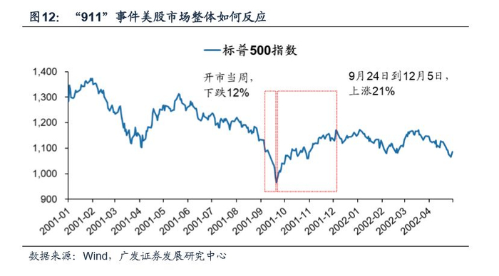 ●历史复盘:2001年“911”美股如何演绎?01年9月11日美本土发生恐袭,之后纽交所休市四天,次周开市。开市当周美股下跌12%,后迎来两个月反弹。由于911对当时本处衰退期的美国经济雪上加霜,市场对未来经济预期再下修,所以开市当周美股周期股跌幅最大,此外受科网泡沫破裂影响的信息技术行业跌幅也较大,而消费股和公用事业相对抗跌。美股反弹后先前跌幅较大的科技类领涨,周期类次之,前期跌幅较小的公共事业和必须消费类相对靠后。美国政府为了应对“911事件”实施降息等宽松货币政策和增加财政支出等积极财政政策进行对冲。