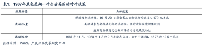 1987年10月“黑色星期一”发生后,美联储迅速为市场提供流动性支持,货币紧缩也转向货币宽松。10月19日崩盘给市场造成了极大的恐慌,美联储立即出手救市。在“量”的层面,美联储不断释放短期流动性,10月20日向银行系统注入170亿美元;表态会提供充裕的流动性,临时放松国债拆借规则,提振市场信心;在此期间,美联储还不断鼓励商业银行为市场参与者提供资金,以延展流动性。在“价”的层面,美联储在1987年11月、1988年1月和2月共降息3次,分别下调50、18.75和12.5BP。